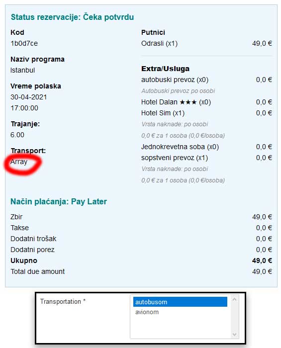 Duration is OK, but transport displays ARRAY and should autobus (bus) ili avion (plane)