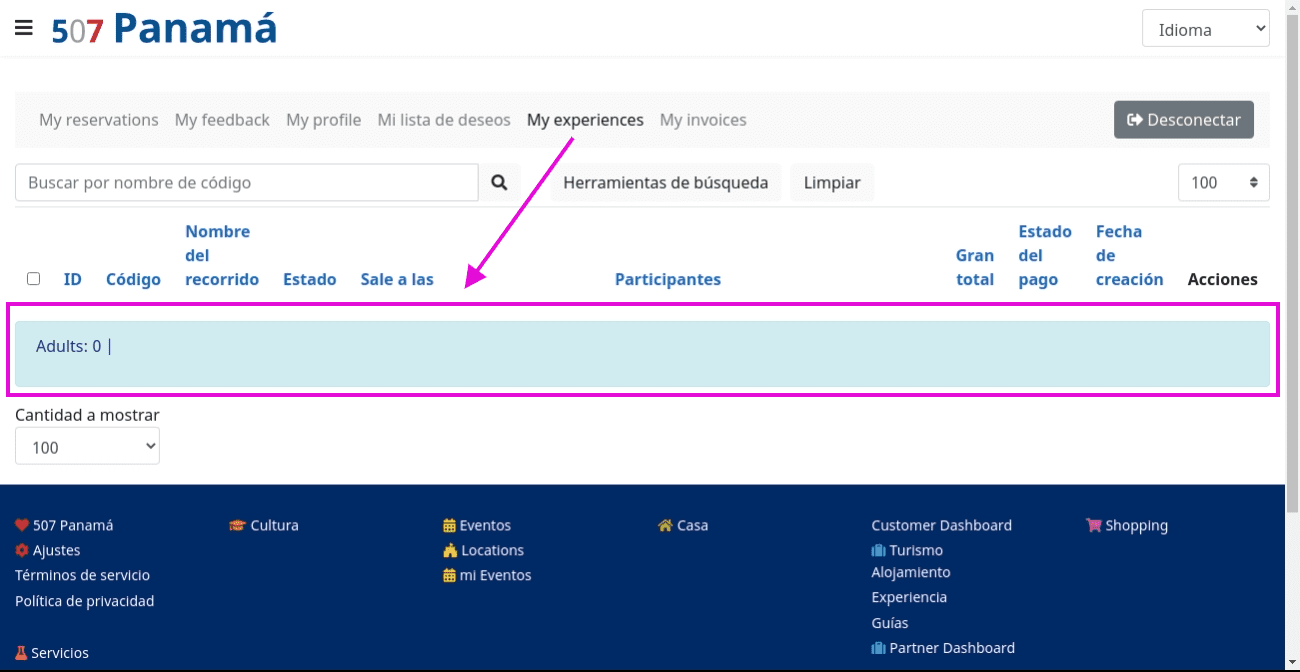 Customer Dashboard > My Experiences: an info alert with " Adults: 0 | " is shown - I add an image