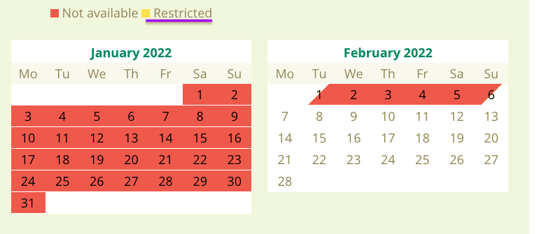 At this moment, in the front end availability calendar, the unavailable dates are marked by red colour, you can not set different colours based on different payment gateway.