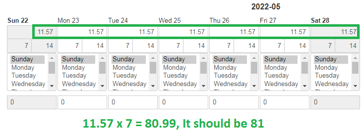 In this case (attached photo) I have one weekly offer which cost 81 euro, but when I enter 11.5714285714 price per day it saves to 11.57. In this case 11.57 summed for 7 days will give the final result as 80.99, instead of 81.