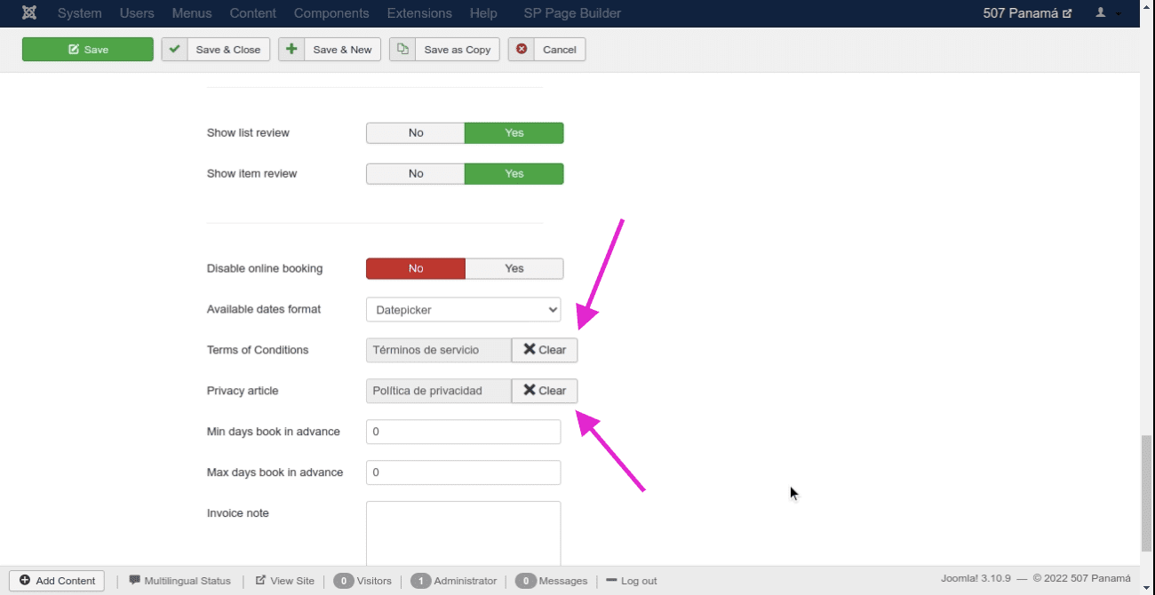 J4 Backend > Solidres Experience > Publishing> Terms and Privacy fields - the Selector button are NOT shown