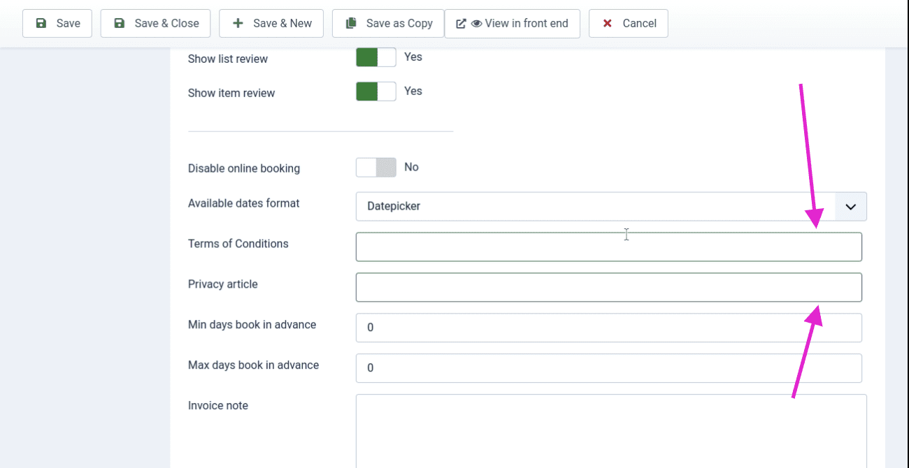 J3 Backend > Solidres Experience > Publishing > Terms and Privacy fields - the Selector button is shown
