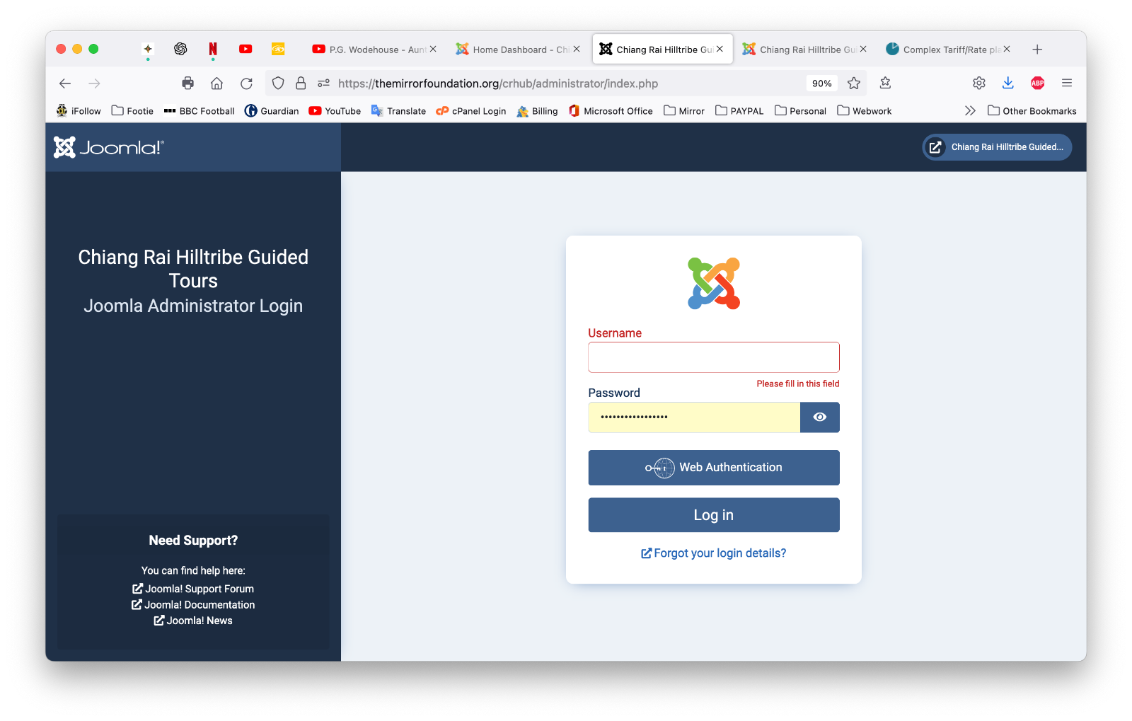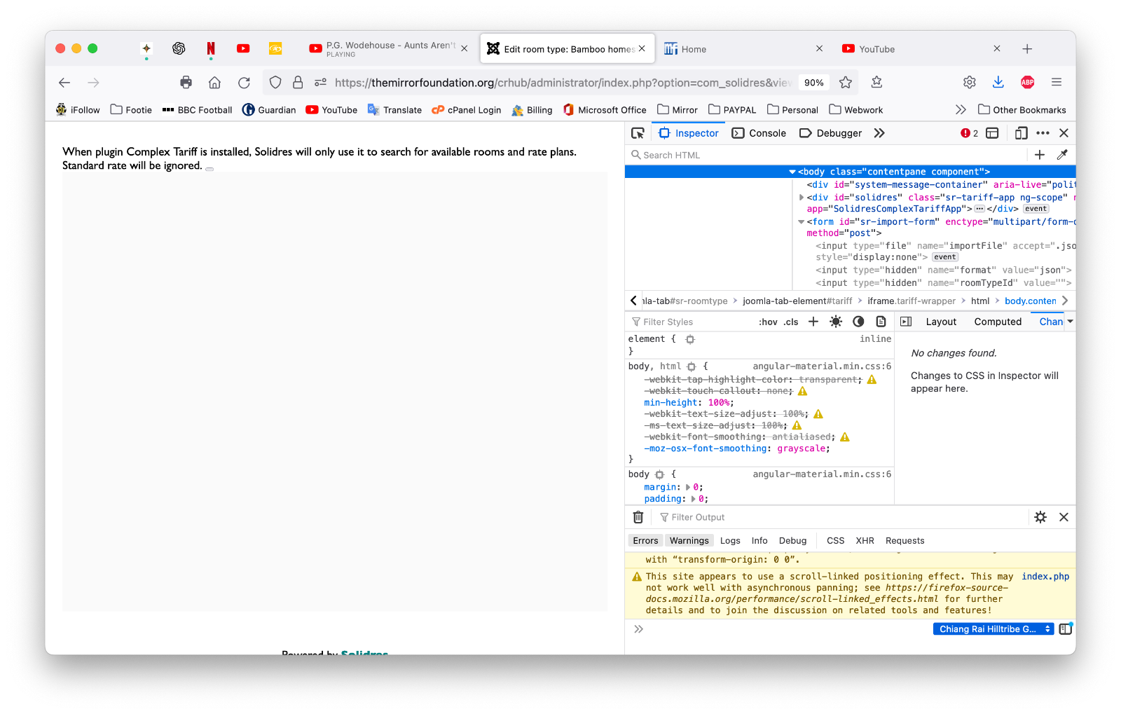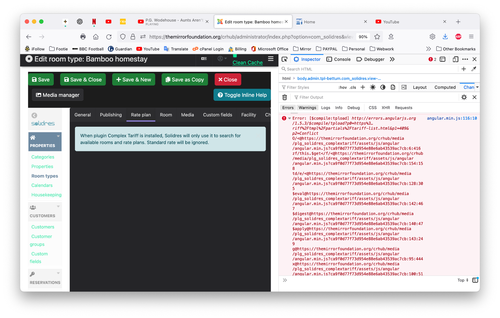 The inspector shows a lot of errors regarding the angular.min.js file (in the Complex tariff plugin assets folder), and Joomla's jquery.min.js file... also, the following warnings appeared: