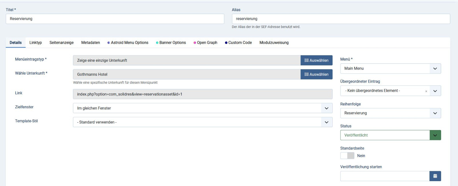 1. Please make sure that you create a menu item with type Solidres > Single property and assign your property for it.