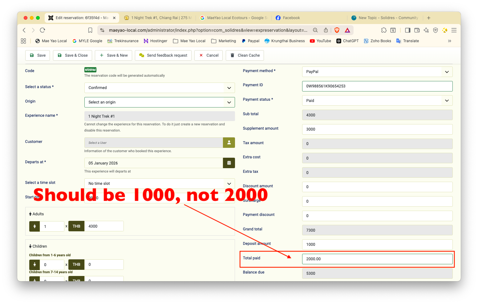 The Paypal payment is a set amount of 1000 THB, and is correct in my Paypal account. It is also correctly 1000 in the reservation deposit amount field, above the total paid field.