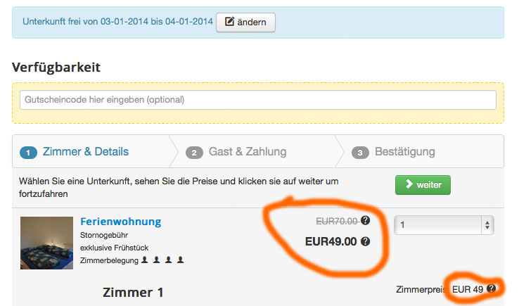 Thank you, that works in 0.6.0 so far. But only for room costs. And only if tax is active. If you set options "show price with tax" to no, tax line is still displayed with price "0" in each row. This is irritating. I think the best solution would be, to erase tax break down in overview but to calculate price correctly with or without tax (as set in options) instead. For example if room price is 50 and tax 0.1 there should be just 55,- in overview (with tax) or 50 ,-(without tax). Keep it simple ;)