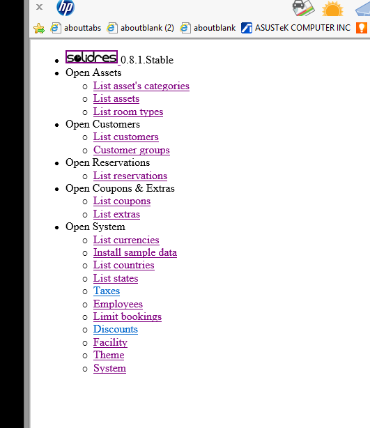 I have downloaded the free version 0.8.1 and try to create a new asset and room type. I've tried with and without the sample data but get the same error. To me it looks like a CSS error. The error occurs only when I click New on both the asset and room type.