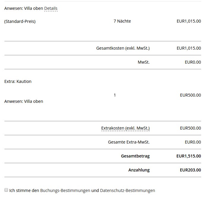 I have made a deposit over 500,00 € as an extra. This works fine but the 20% pre payment should calculate this only to the room costs without the deposit. Have you an idea to do this?