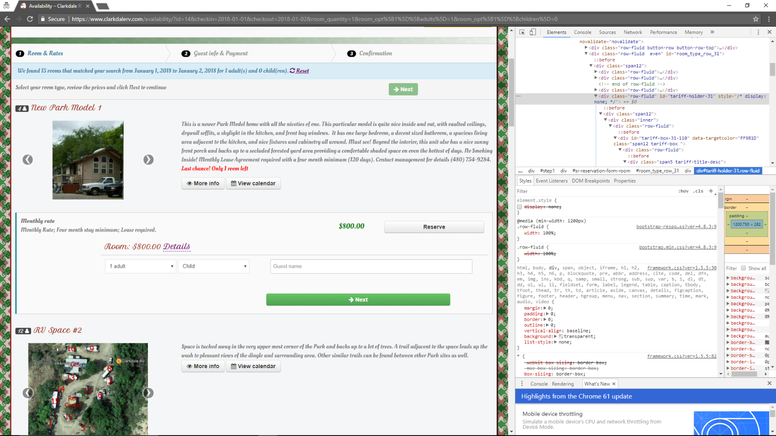 Supposedly after an availability search, if a room is available, a "tarrif-holder-..." div should be visible following each available room type which typically contains the rate information and the "Reserve" button, but for some reason, after one of the most recent updates, I have noticed that these <div> containers are being hidden with an in-line style definition (<div id="tarrif-holder..." style="display:none">). This seems very strange to me and I think perhaps it could be a bug, being that the room types are available, but before I report it as a bug, I was hoping someone might already have come across this problem recently and perhaps there is a new default option that needs to be set somewhere in the assets or settings somewhere that would cause this "tarrif-holder" to display or not. I can't imagine a scenario where you wouldn't want this to display if an asset/room is available, but I think it would be smarter for SolidRes not to use the "display:none" in-line (in the <div>) but rather in a CSS statement so that it could more easily be customized.