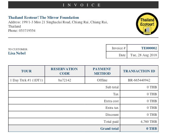 The payment details show correctly in the payment tab. I generated an invoice and emailed to myself (I set the customer email address to ours as we don't have access to their details in Trip Advisor's booking system), and the invoice is correct.