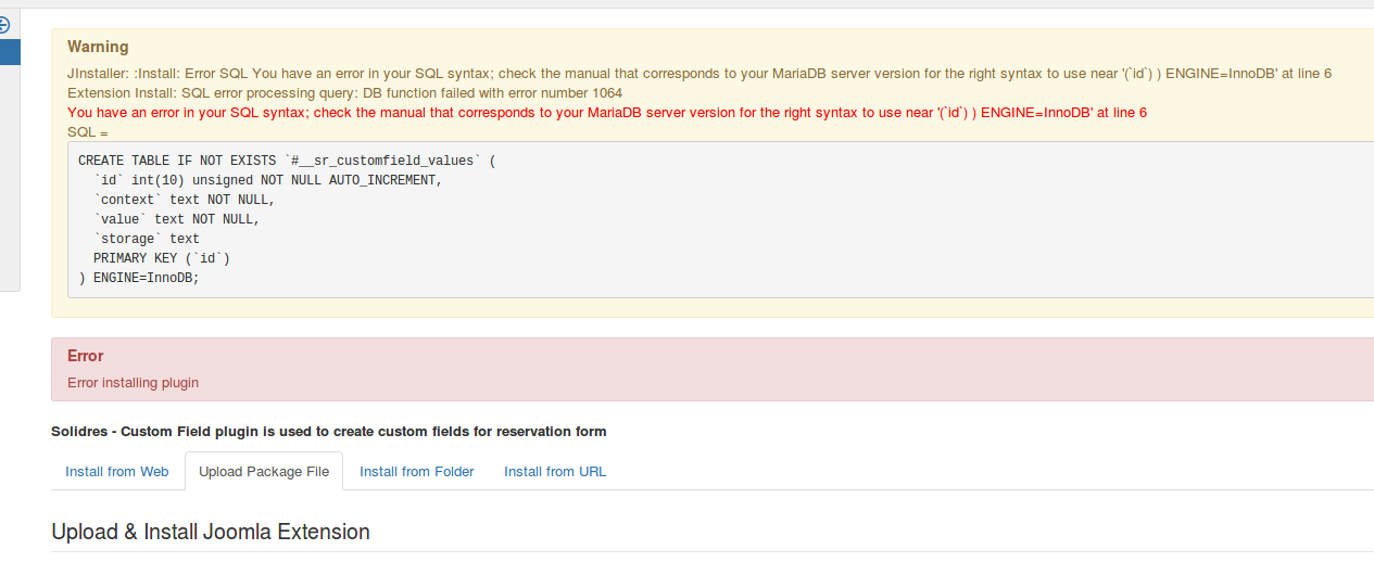 JInstaller: :Install: Error SQL You have an error in your SQL syntax; check the manual that corresponds to your MariaDB server version for the right syntax to use near '(`id`) ) ENGINE=InnoDB' at line 6