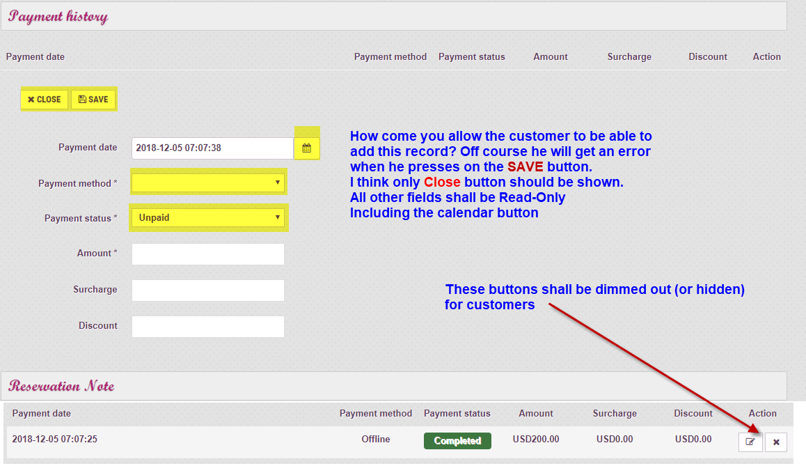 Besides, checking for reservations by guest who did not register online is a good feature. However, it does give the gusts a chance to click on few buttons that they should not be allowed. For instance: Save, Payment status, etc. Please the picture attached.