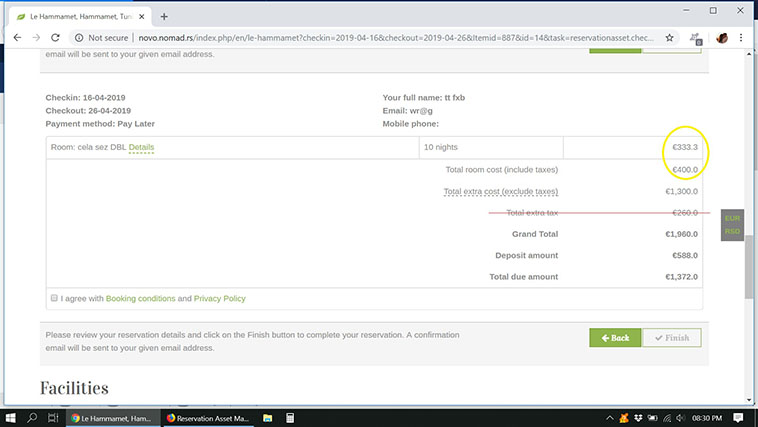 Is it possible in reservation application step #1.Rooms&Rates until step #3.- confirmation to display total amount without visible tax amount for #extra and #hotel accommodations?