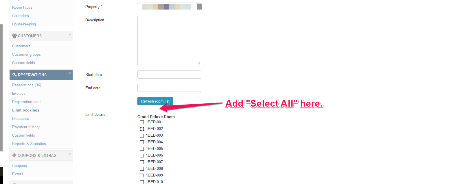 In the Admin Dashboard > Reservations > Limit Bookings, after "Refresh Room List" button , please add option for "Select All" to select all rooms.