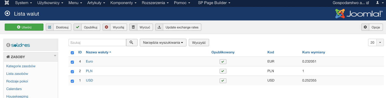 I have loaded a Template that came with Solidres , I have created and published my Countries currency which is South African Rand and have also unpublished all other currencies .