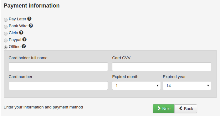 We’d like to show the first preview of our upcoming Offline credit card payment plugin. This plugin is useful when you only want to collect credit card info (not process/capture it) and store it for manual processing later. This new plugin will be compatible with our upcoming 0.8.0 release.