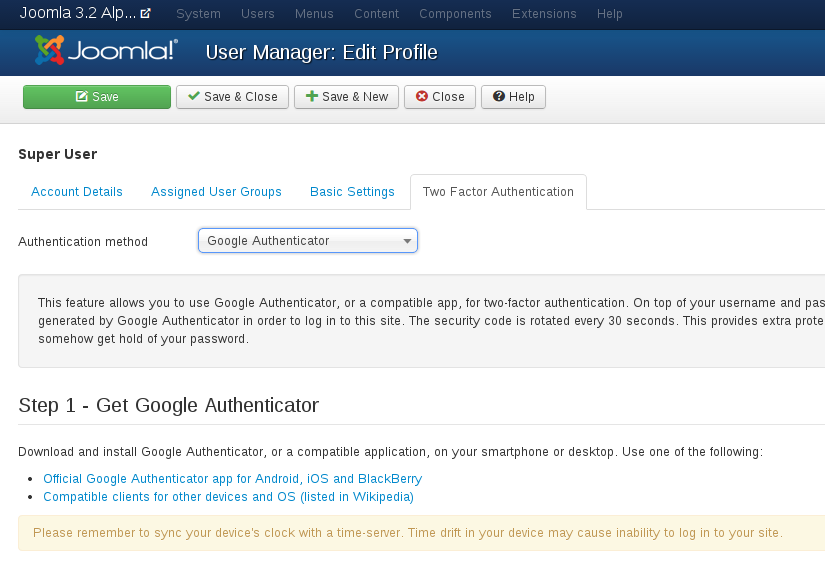 One of the most exciting new features in the upcoming Joomla 3.2 is two factor authentication, when enabled this feature, beside the username you will be required to enter your password + a time based secret key (this key is changed every 30 seconds), that is the reason why it is called “two factor”. This feature enhances your website’s security because a single password is considered not security enough nowadays.