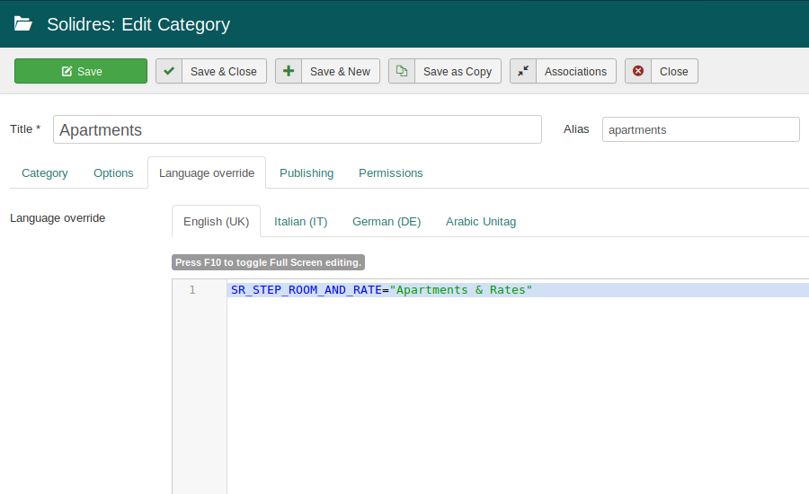 Actually, this is not a new feature, we had it for a while. However, the old implementation requires to modify language files which are not very convenient. Since Solidres for Joomla v2.9.0, we improve this feature by allowing managing language override per category right in the Joomla category edit form, please check it in the screenshot below.