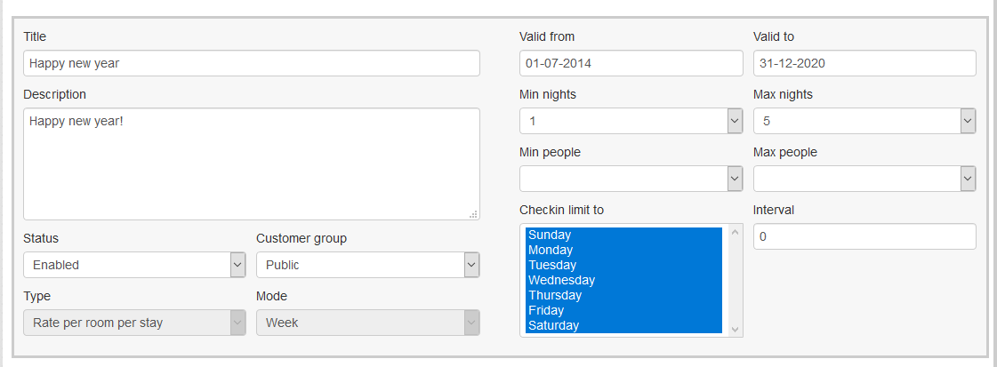 Interval (since v1.9.3): allow you to configure a fixed interval that your guest have to select: for example if your Min Night = 7, Max Night = 21 and Interval = 7, then in the front end, your guest is only able to choose 7 nights, 14 nights or 21 nights.