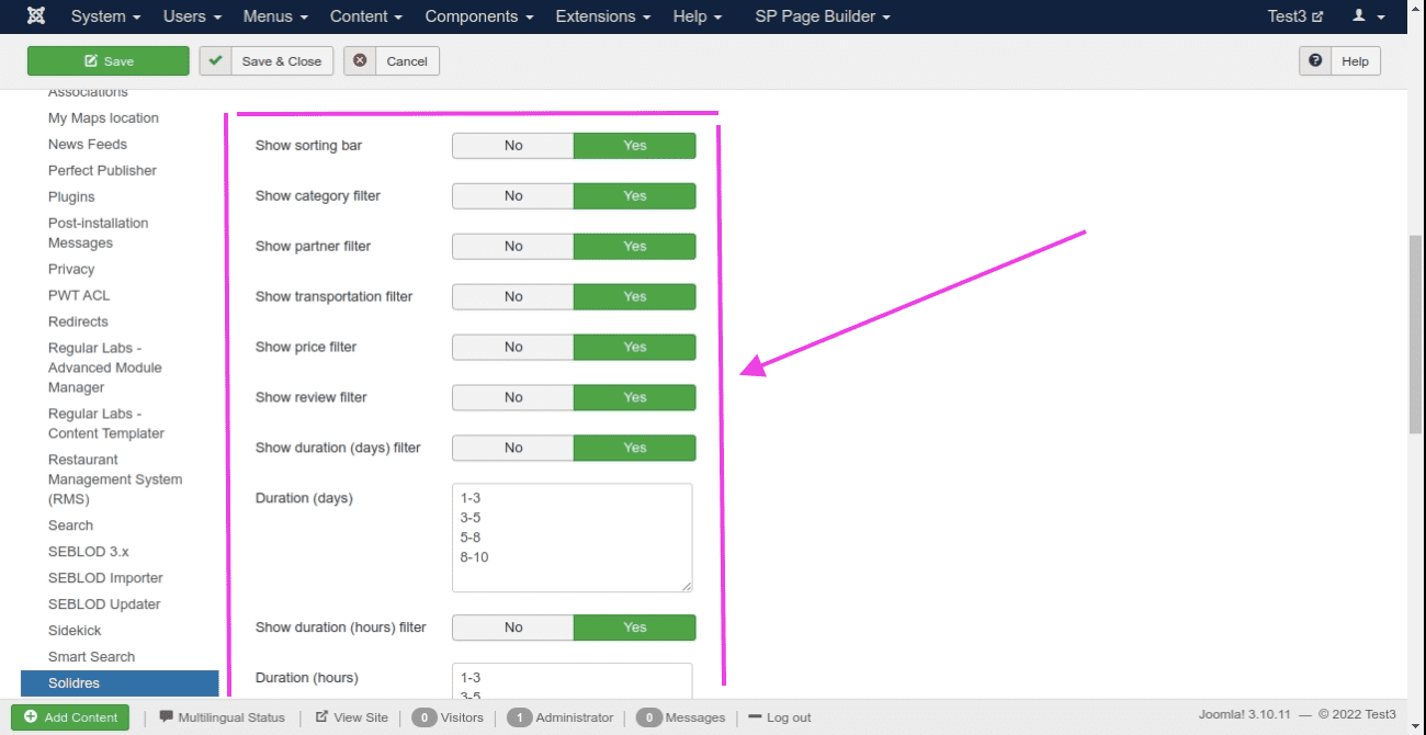 PHP 7.4.30 + Joomla 3.10.11 / 4.2.2 + Solidres 2.12.9 + Experience Filter module 0.5.1 etc