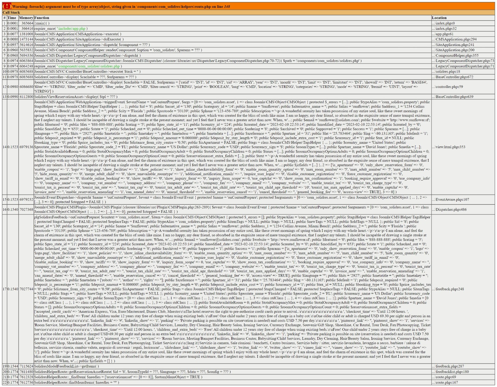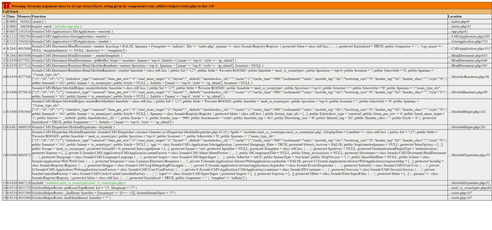 I am now getting this warning though: `Warning: foreach() argument must be of type array|object, string given in \components\com_solidres\helpers\route.php on line 148` (full error attached with paths stripped of machine info). This is causing the carousel from Module Room Types on the Home page to not play. An error also appears on the Reservations page (also attached), though I don't notice any effects.