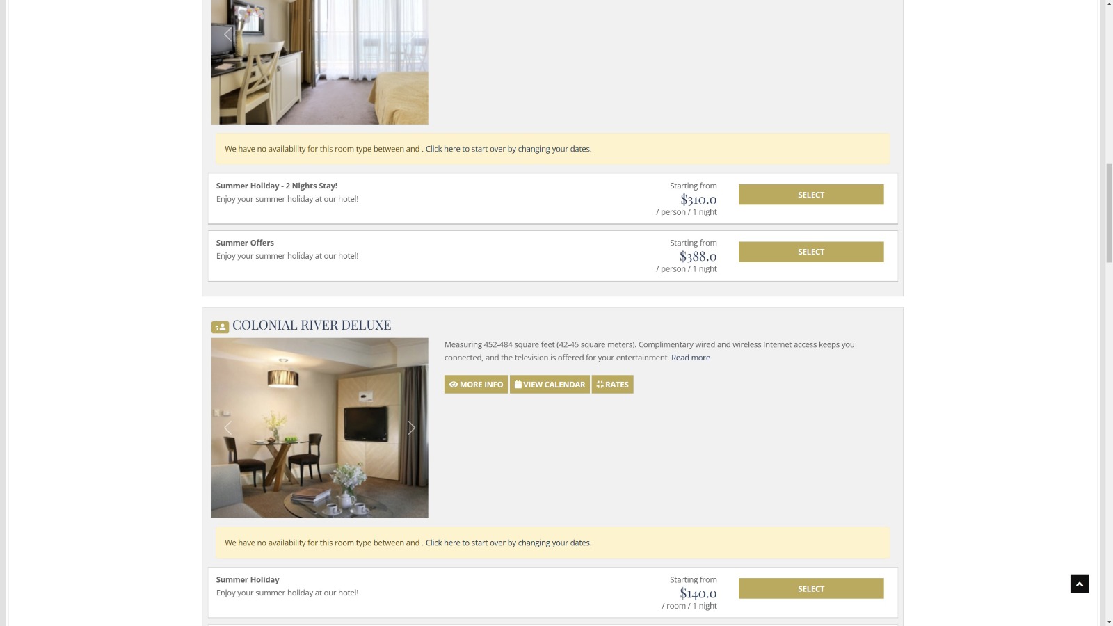 I downloaded the Joomla Infinity Bundle Quickstart 4.0.0 and installed it, but when I view the site and go to Hotels -> Reservations, under each room it says "We have no availability for this room type between and . Click here to start over by changing your dates." This errored text does not appear on the demo site. Clicking it scrolls the windows to the 'book-form' element (where the results are) rather than the date selector at the top of the page.
