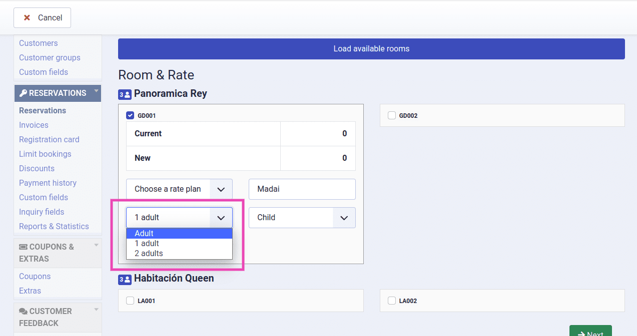 - I select the booking dates, the Property and the User. Then I load available Rooms