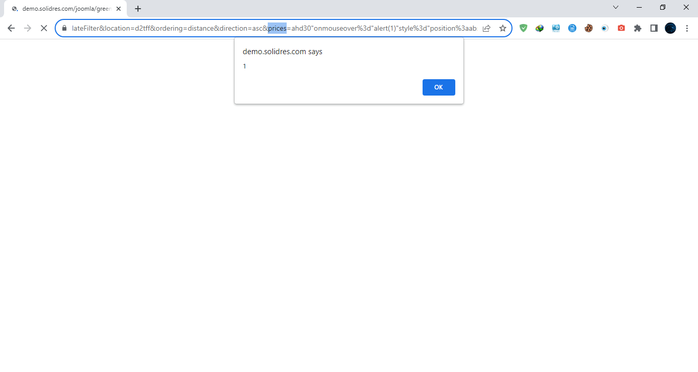 https://website/joomla/greenery_hub/index.php?option=com_solidres&task=hub.updateFilter&location=d2tff&ordering=distance&direction=asc&prices=[XSS]