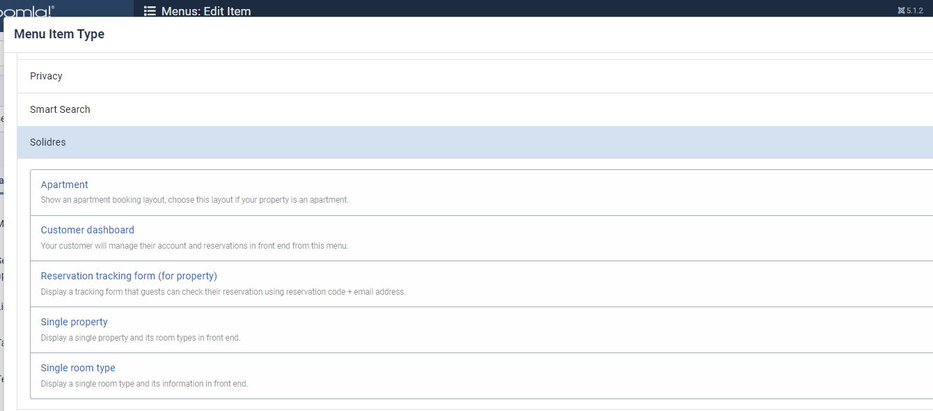 I have installed the solidres and browsing the site and cofigurations. But I'm stuck at the item 4 from the Initial Configuration which I can't find the item pointed for the MENU ITEM TYPE ""Solidres - Show a single reservation asset". From my side I can only see 5 options to choose from, but none of them is what I need.