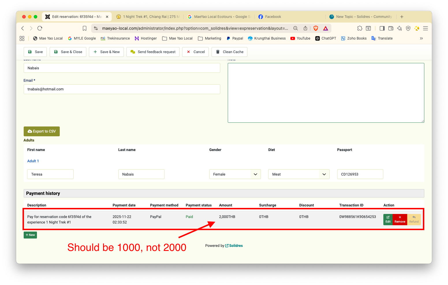 The Paypal payment is a set amount of 1000 THB, and is correct in my Paypal account. It is also correctly 1000 in the reservation deposit amount field, above the total paid field.