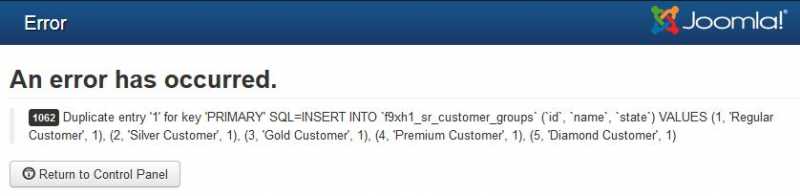 1062 Duplicate entry '1' for key 'PRIMARY' SQL=INSERT INTO `f9xh1_sr_customer_groups` (`id`, `name`, `state`) VALUES (1, 'Regular Customer', 1), (2, 'Silver Customer', 1), (3, 'Gold Customer', 1), (4, 'Premium Customer', 1), (5, 'Diamond Customer', 1)