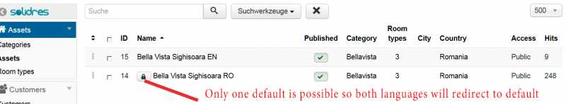 The hotel site (still installed on xampp) is multiligual. On the HOME section there ist the Check availability module installed in both languages.In the admin assets area i have created 2 categories, (one for each language) in which i linked one asset which is also created twice - for each language 1. Its called asset1 - EN and asset2 - RO. So I have created two assets for the same location to be able to translate the descriptions inside it.