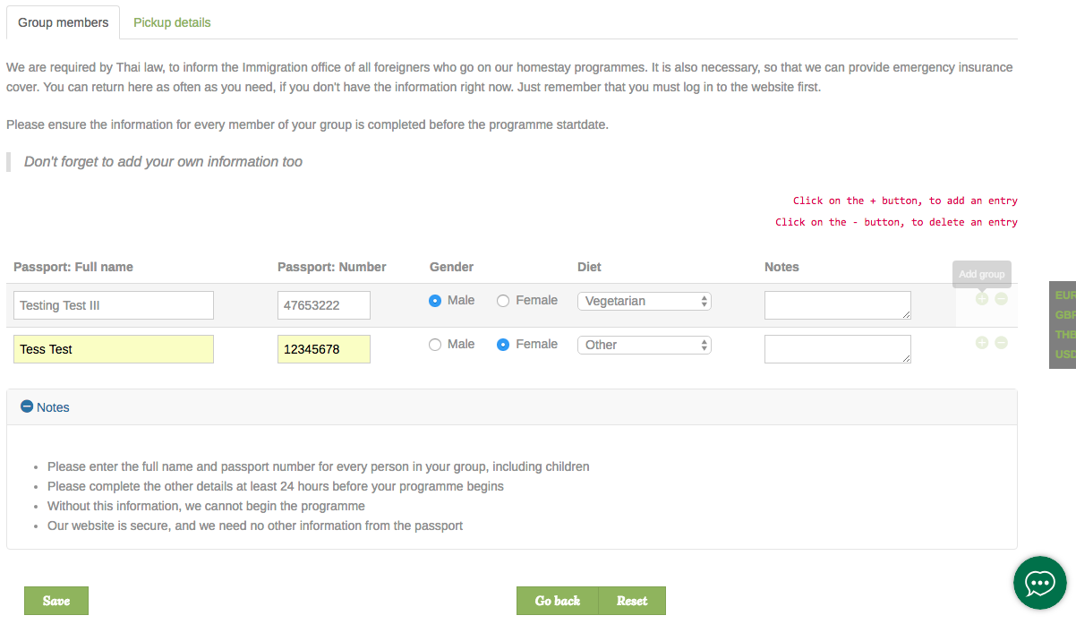 Full passport name, passport number, gender, diet (no restrictions, vegetarian, vegan, other), notes. The enables us to purchase emergency insurance cover for the group, and arrange accommodation and meals.