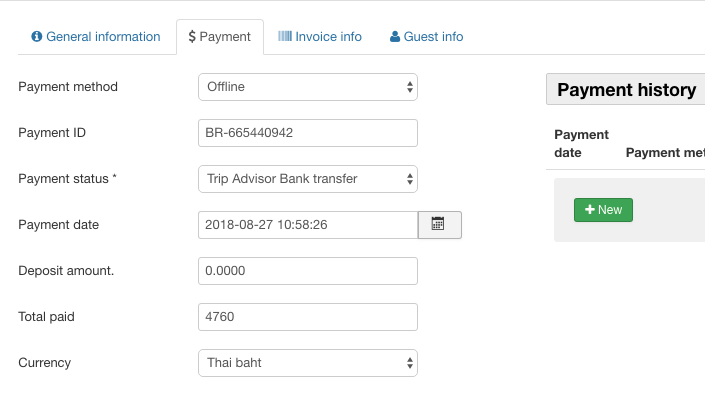 But the payment details do not show in the General information tab...? The only thing I can think of, and I can't see why it would be relevant, is that I am using a non-standard status which I created for Trip Advisor payments.