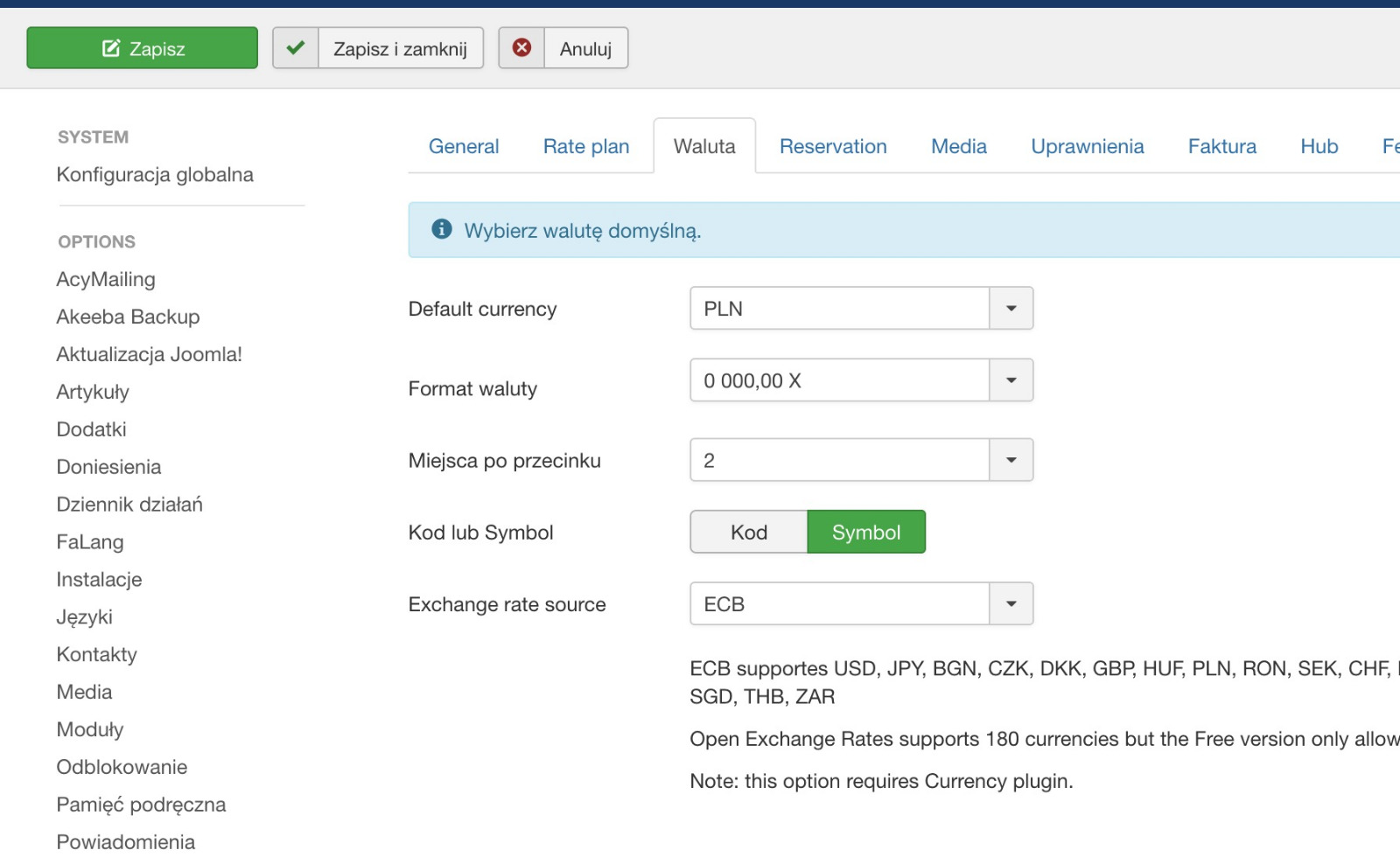 I have set default currency (PLN) and other curiences: EUR, USD