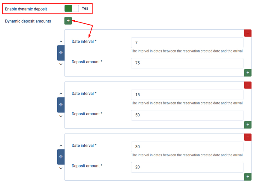 Since Solidres 3.3.0 BETA, you can now test the new Dynamic deposit feature. It can be activated from your property > Publishing > Enable dynamic deposit, from there you can define multiple deposit amounts based on the interval between the reservation created date and the arrival.